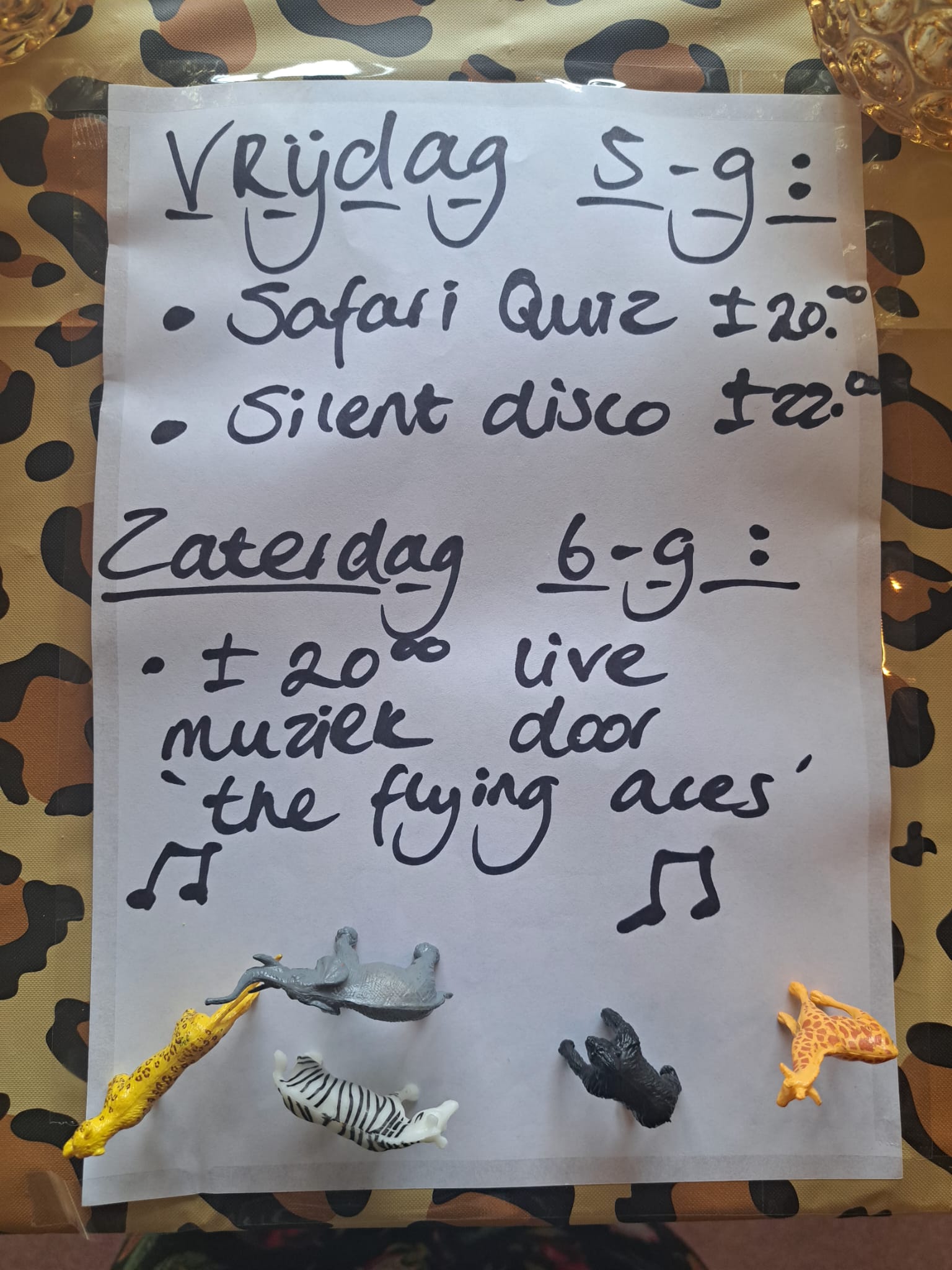 Maar nu wordt het donker, we trekken ons terug onder de klamboe; de reis is nog lang. Zo is er vrijdag rond 20.00 een bloedstollende Safari Pubquiz en vanaf 22.00 een zwoele Silent Disco. Zaterdag rond 20.00 is er fijne live muziek van niemand minder dan onze lokale GLTB-muzikanten, The Flying Aces.